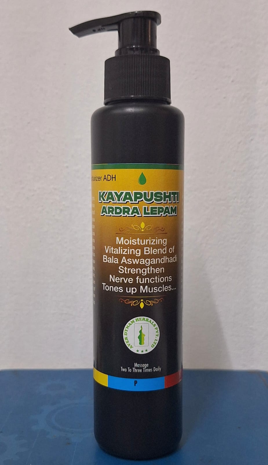Kayapushti Ardra Ileam is a carefully crafted herbal moisturizing lotion widely used for body massage, featuring Bala, Ashwagandha, and Laksha as its key ingredients. This formulation effectively relaxes nerves and muscles while revitalizing neuromuscular activity. Regular application promotes a sense of calm and elevates energy levels. It combines coarse powders of potent herbs with sesame oil and curd supernatant, enriched further by a fine blend of supportive botanicals, offering expert care for maintaining muscular and neurological health through daily use.