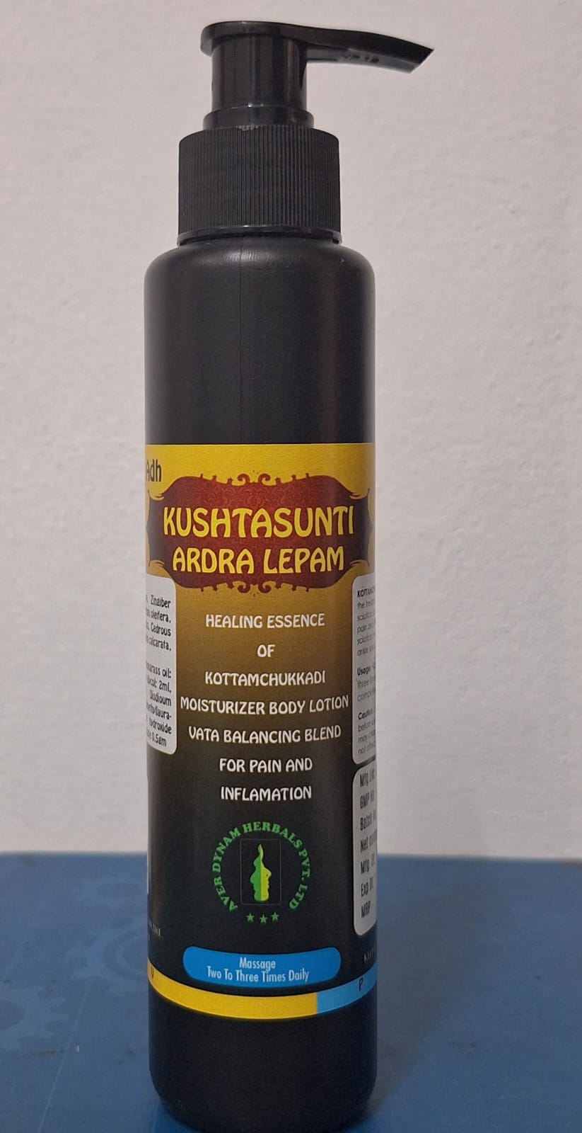 Kushtasunti Ardra Lepam, enriched with the healing essence of Kottamchukkadi. is formulated to alleviate pain and inflammation. Its potent ingredients include Indian costus root, dry ginger, calamus, moringa, garlic, Indian caper, Himalayan cedar, mustard, rasna, and tamarind. Traditionally used for neuro-muscular discomforts such as sciatica, spondylosis, and arthritis, this lepam helps reduce numbness, pain, and stiffness. It is effective in managing conditions like myalgia, neck and ankle sprains, blunt knee injuries, and tennis elbow, offering targeted relief for musculoskeletal ailments.